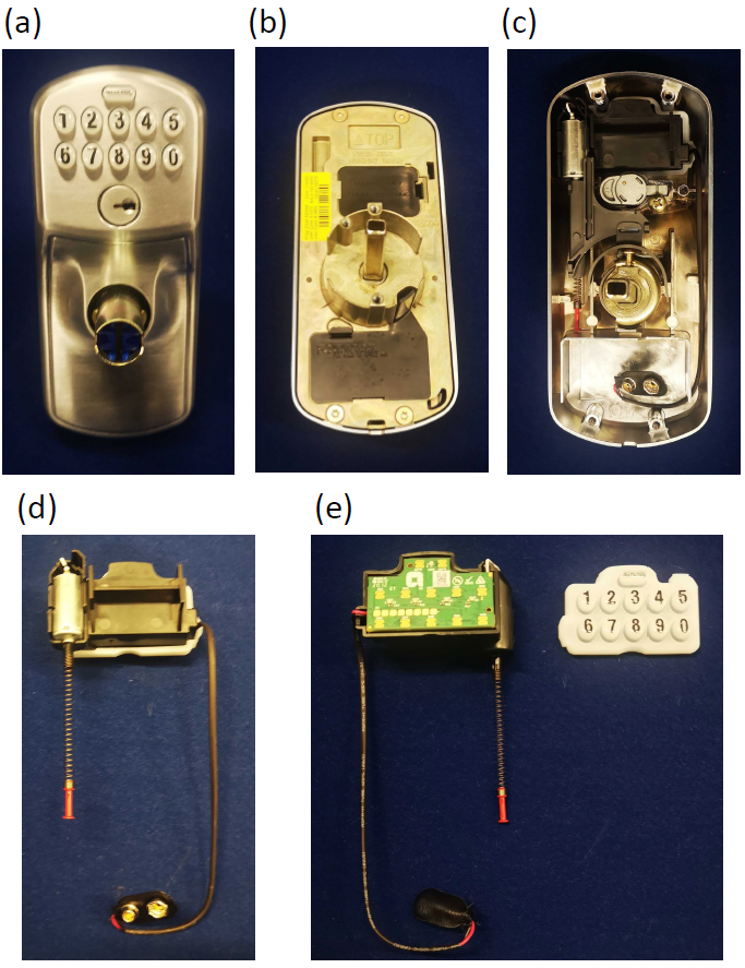 Fig. I Tear-down of the electronic lock: (a) front side; (b) back side; (c) with back panel removed; (d) the electronic assembly; (e) the circuit board is visible after removing waterproof silicone rubber keyboard.