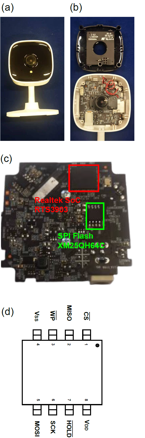 Fig. II (a) the front side of the TP-link Tapo C100 IP camera; (b) with the front panel removed; (c) the back side of the main board; and (d) the pin definition of the MX25QH64 SPI Flash chip.